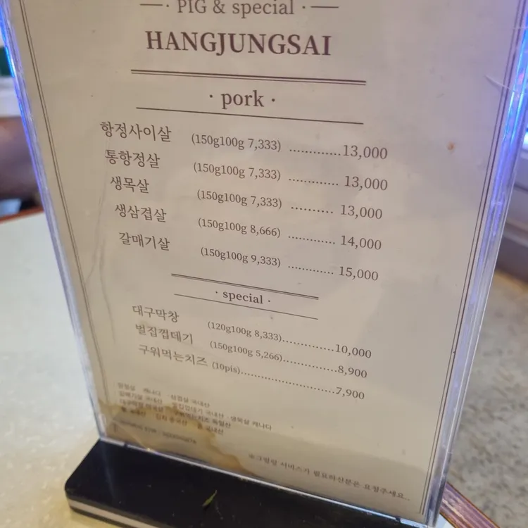 영등포역 5번, 6번출구에서 280m, 약 5분거리에 위치하고 있습니다. 항정살 전문이지만 삼겹살, 생삼겹살, 문어, 조개, 막창 등 메뉴가 다양하다. 포트정사이 영등포점 영등포구 영종로4길 13-2 1.2층0507-1366-8986 평일 15:00~24:00 주말 12:00~24:00☆☆ 예약시 김치찌개 제공 네이버 코르키지 서비스도 가능합니다. 아기의자 × 포트정 사이
