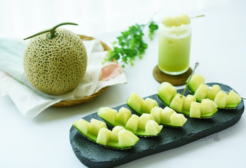 멜론을 입방체로 자르고 블렌더에 넣어 갈아주세요.