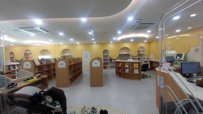 2층에는 어린이자료실이 미취학 아동들이 뛰어다니며 책을 읽기에 좋은 환경임을 알 수 있다.