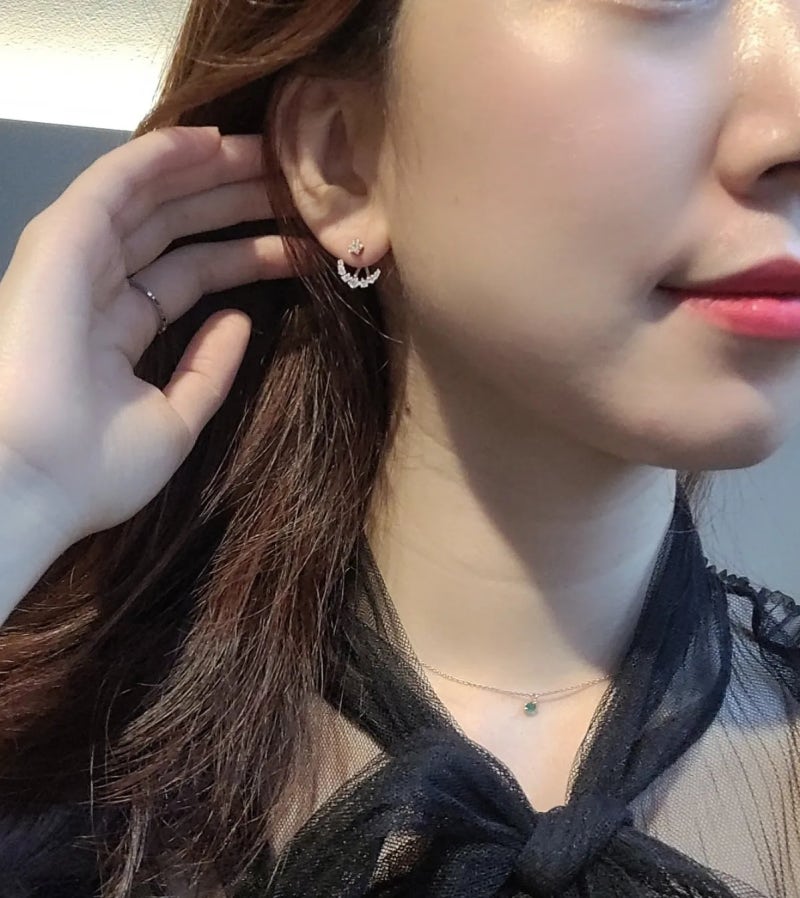 루이 브이 이어링은정면에서는 동글동글 곡선이 살아있는 V 쉐입,측면에서는 유선형의 슬림한 바 쉐입으로 보여요 :)각도에 따라 다르게 보이는게 매력있죠!