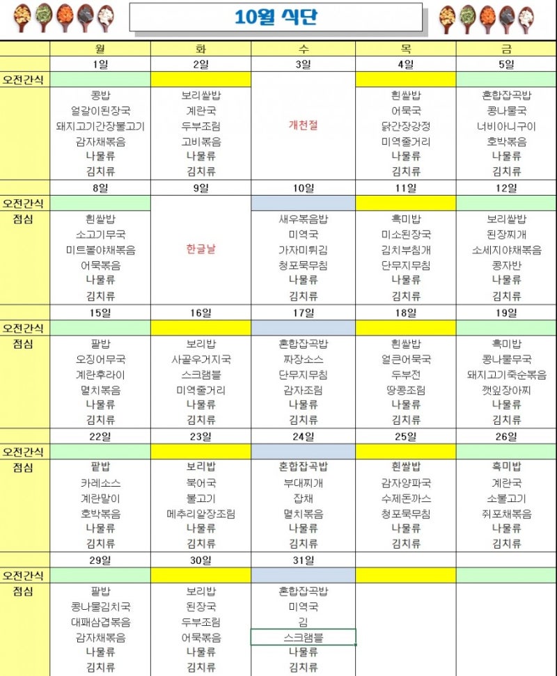 10.1510.1610.1710.1810.1910.2010.21 조식 베이컨롤 토스트 몬테크리스토 토스트 허니 까망베르 프렌치토스트 애플잼 토스트 에그토스트 애플소스 토스트 까망베르 런치 계란찜 두부찌개 감자된장국 돈까스 전채 된장국 새우전 해초 오믈렛 오뎅 스프 새우전 해초 ed 오믈렛 디너 오믈렛 미니 돈까스 오므라이스 카레 카레 새우볶음밥 외식