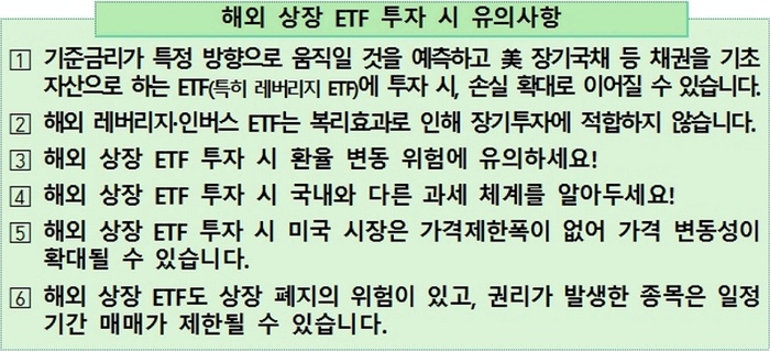 ① 원금손실 위험이 있는 펀드상품이므로 주의하시기 바랍니다. 상장지수펀드인 ETF는 저렴한 비용으로 다각적인 투자가 가능하고 실시간으로 시장에서 거래될 수 있다는 점에서 개인투자자들에게 인기가 높다. 단, 원칙적으로 보증되는 상품은 아닙니다. 정해진 투자기간 동안 손실이 발생하면 손실을 감수하고 매도해야 합니다. 투자에는 항상 주의가 필요합니다.